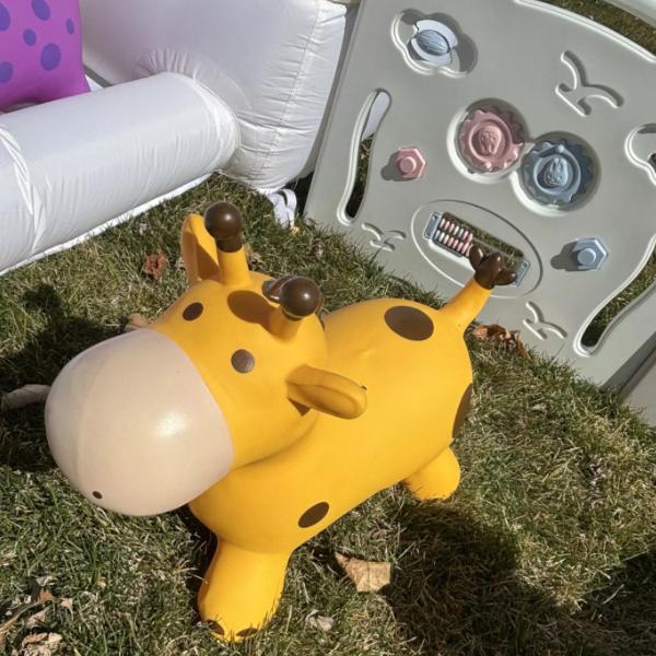 We have two bouncy houses that are under 8 foot tall featured in the pictures. We have a plastic fence, which has a built-in gate, and locks into place. Inside the enclosure we have a plastic teeter totter, a free-standing plastic slide, a multi piece foam climbing apparatus (grey fabric covers), foam blocks (multicolored fabric covers), 2 different sets of rubber mats (1 grey colored 1 sand color), a fabric tunnel, and multiple rubber bouncy animals. These are all featured in the pictures. As an add on they can rent our bubble machine. One bottle of bubbles is part of the rental cost.